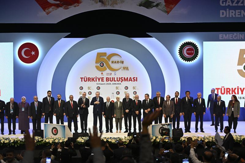 Cumhurbaşkanı Erdoğan, HAK-İŞ'in 50 yıllık zorluklarla dolu yolculuğunun, başarılı bir emek mücadelesi olmasının yanı sıra Türkiye'nin bagajlarından kurtulmasını da temsil ettiğini vurguladı.