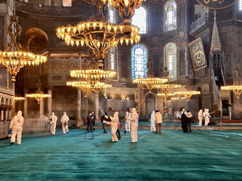 Halılar elektrik süpürgeleriyle süpürüldü, tozu alınan ayakkabılıklara ve caminin içine dezenfektan sıkıldı. Şadırvan, cami avlusu ve Ayasofya meydanı sıcak su ve dezenfektanla yıkandı. Temizlik işlemi sonrası caminin içine ve dışına gül suyu sıkıldı.
