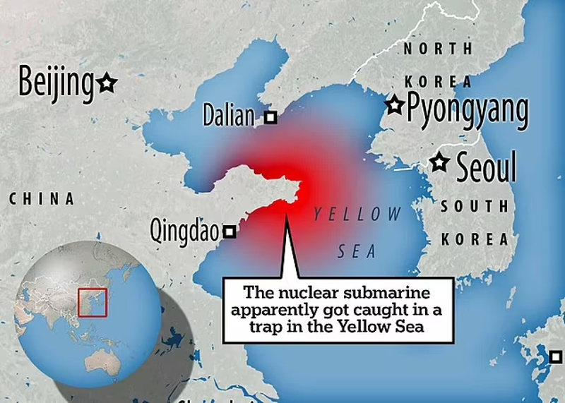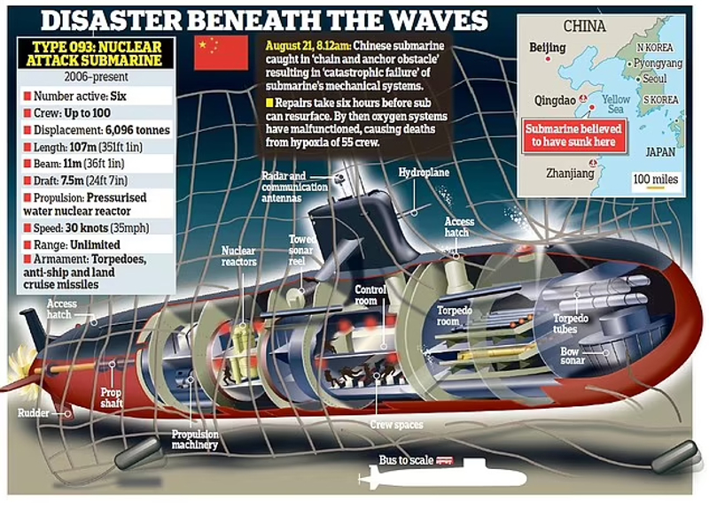 İngiliz basını, Çin'e ait bir nükleer denizaltının 55 mürettebatıyla okyanusta battığını ileri sürdü. Trajik iddia İngiliz istihbarat raporuna dayandırıldı. Nükleer denizaltının ABD ve müttefik denizaltılarını tuzağa düşürmek için kullanılan bir zincir ve çapa engeline çarptığı ileri sürüldü.