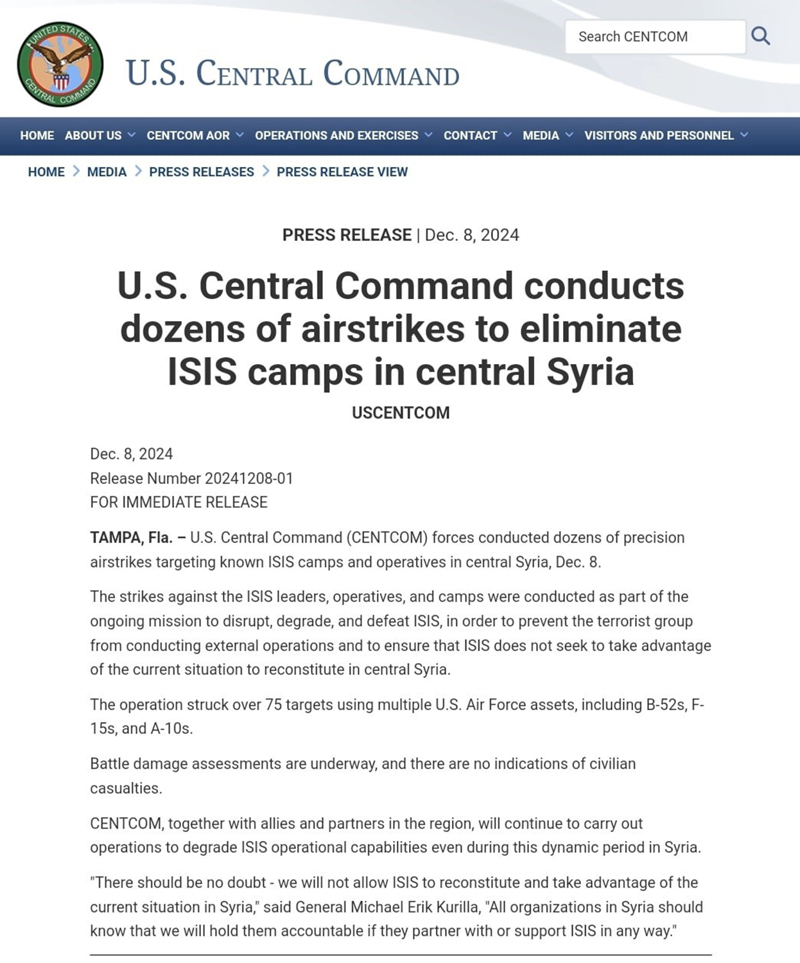 Konuya ilişkin açıklama yapan CENTCOM Komutanı General Michael Erik Kurilla, "Hiç şüpheniz olmasın ki DEAŞ'ın yeniden yapılanmasına ve Suriye'deki mevcut durumdan faydalanmasına izin vermeyeceğiz." değerlendirmesinde bulundu.