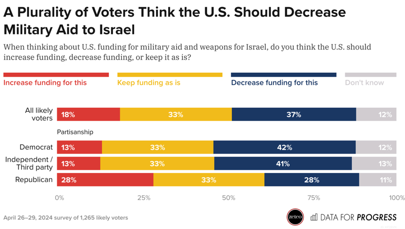Ankette ABD'li seçmenlere yöneltilen "ABD'nin İsrail'e silah yardımında bulunmasını destekliyor musunuz?" sorusuna gelen cevaplar ise, İsrail'in her geçen gün destek kaybettiğinin bir göstergesi oldu. Seçmenlerin büyük çoğunluğu, İsrail'e gönderilen silahları ve milyarlarca dolar bütçeyi onaylamadığını belirtti. Bununla birlikte seçmenlerin 3'te birinden fazlası, İsrail'e yapılan yardımların azaltılması gerektiği görüşünde.