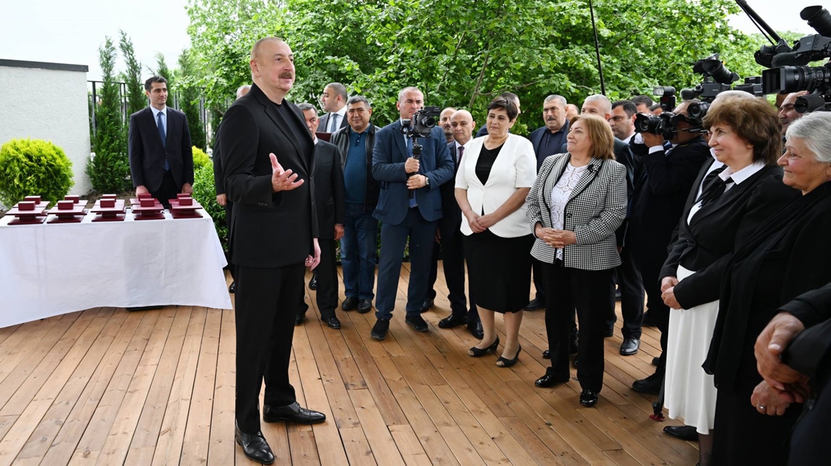 Dairelerin anahtarlarını sakinlerine teslim eden Aliyev ve eşi, bazı evleri ziyaret etti.