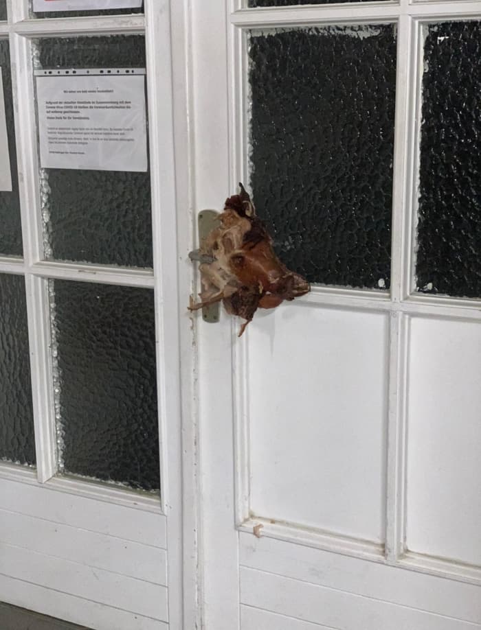 Diyanet İşleri Türk İslam Birliğine (DİTİB) bağlı Fatih Camisinin kapısına dün akşam saat 23.30 sıralarında iki kişi domuz kafası asarak olay yerinden hızla uzaklaştı. Camiye yapılan saldırı güvenlik kameralarınca kaydedildi.