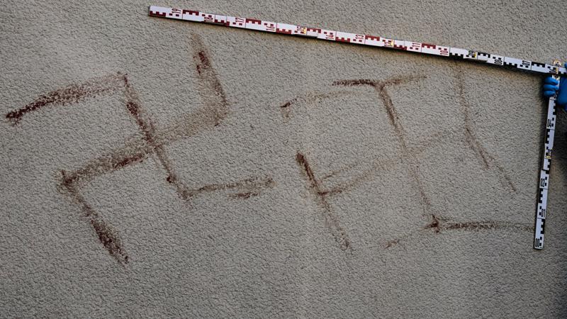 Söz konusu sıvıyla aracın kaputunun üzerine gamalı haç çizilirken, polisler daha sonra çevrede çok sayıda aracın, posta kutularının ve binaların dış cephelerine de aynı işaretin yapıldığını tespit etti.