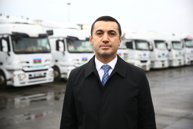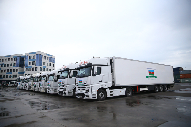 Başkent Bakü'den yola çıkan, 10 tırdan oluşan ve 200 ton gıda malzemesi taşıyan konvoyu Azerbaycan Dışişleri Bakanlığı yetkilileri uğurladı.