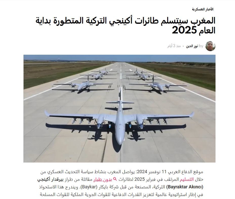 Arab Defence'in haberinin devamında gizli bir kaynağın Le Collimator gazetesine verdiği röportajda "Türkiye, Bayraktar AKINCI insansız hava araçlarını Şubat 2025'te Fas'a teslim edecek" dediği aktarıldı.