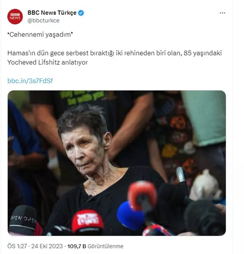 İsrail'in Gazze'ye olan insanlık saldırılarını görmezden gelen İngiliz yayın kuruluşu BBC , yeni bir algı operasyonuna imza attı. Hamas tarafından serbest bırakılan 85 yaşındaki İsrailli kadın esir Yochaved Lifshitz'in kötü muamele gördüğünü iddia eden BBC'nin haberini İsrailli esir kadın yalanladı.