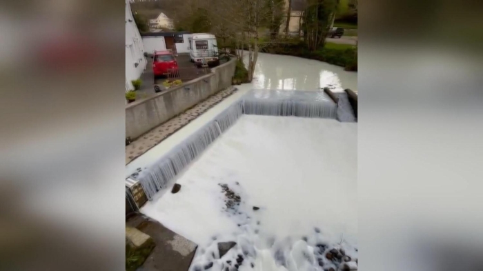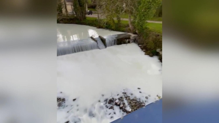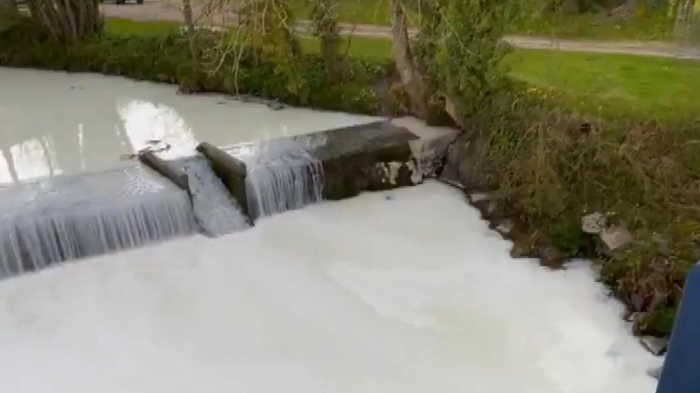 Birleşik Krallık'a bağlı Galler'de nehir beyaza büründü. Carmarthenshire bölgesindeki Llanwrda kasabasında süt taşıyan kamyon, kontrolden çıkarak nehre düştü.
