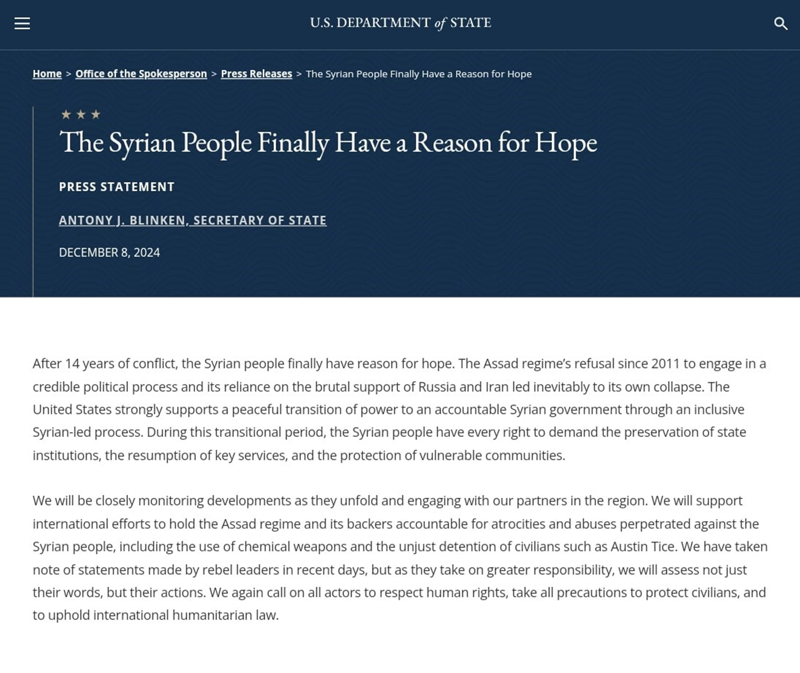14 yıllık ihtilafın ardından Suriye halkının artık ümitlenmek için sebepleri olduğunu belirten Blinken, ABD'nin kapsayıcı ve Suriyeliler tarafından yürütülen barışçıl geçiş sürecini desteklediğini bildirdi.