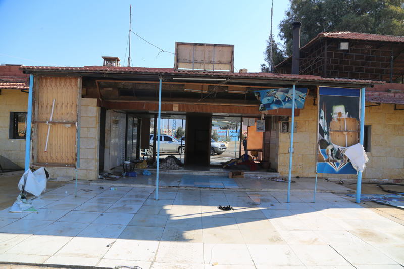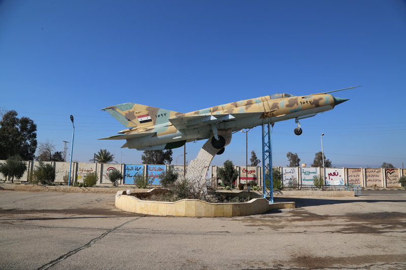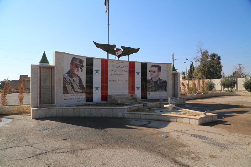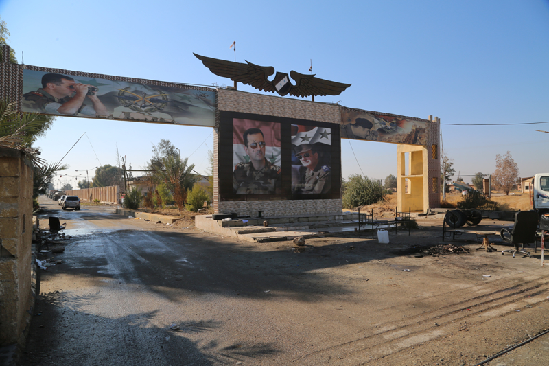 Rejim güçlerinin terk ettiği Deyrizor Havaalanı'nın girişinde devrik lider Beşşar Esed'in fotoğrafının olduğu anıt yer alıyor.