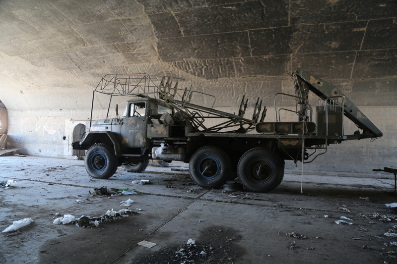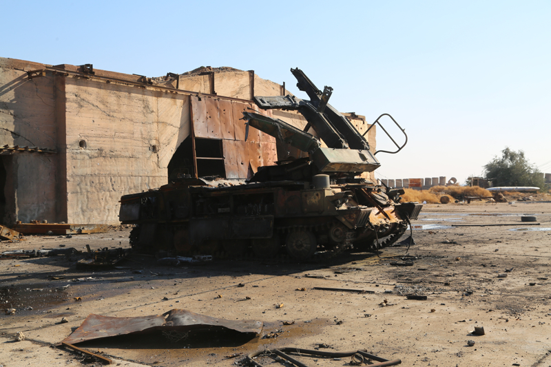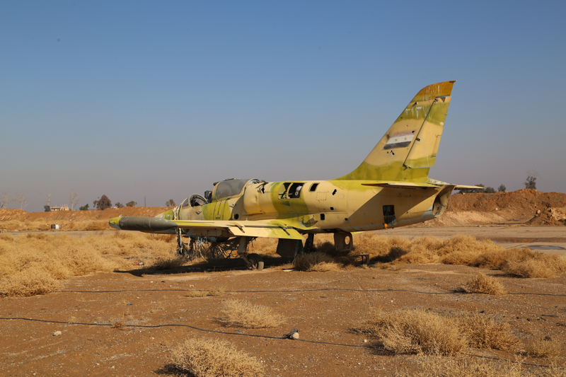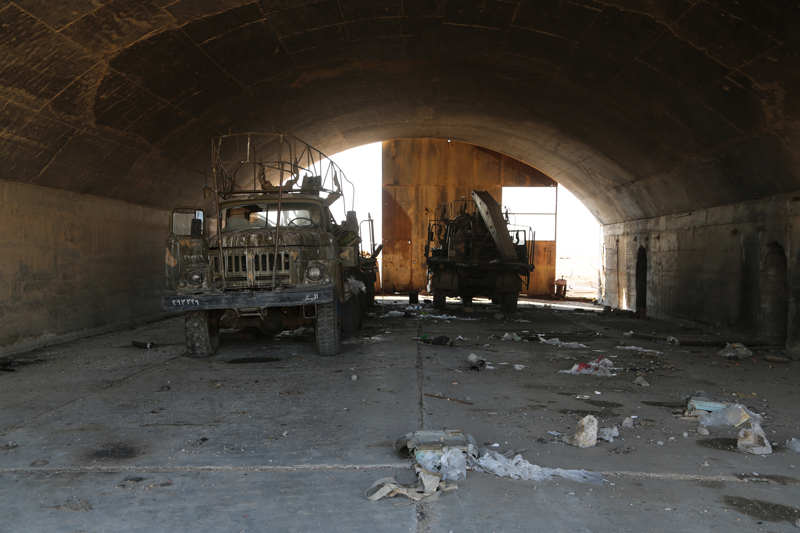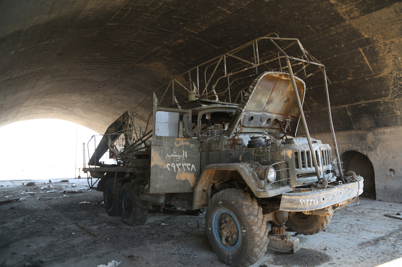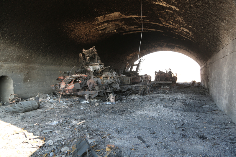 Havaalanında bazıları hasar alan tank, helikopter ve askeri uçaklar ile uçaklarda kullanılan mühimmatlar bulunuyor.