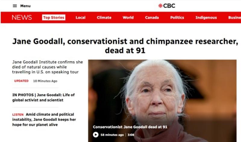 Kanada medyası, Şempanze araştırmacısı Jane Goodall'ın ölümünü manşetine taşıdı.