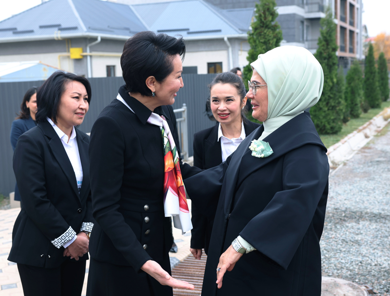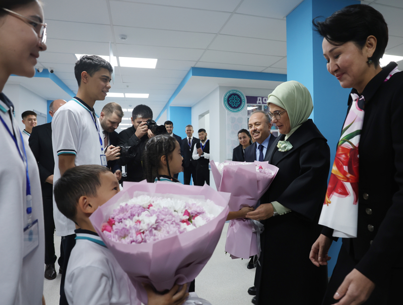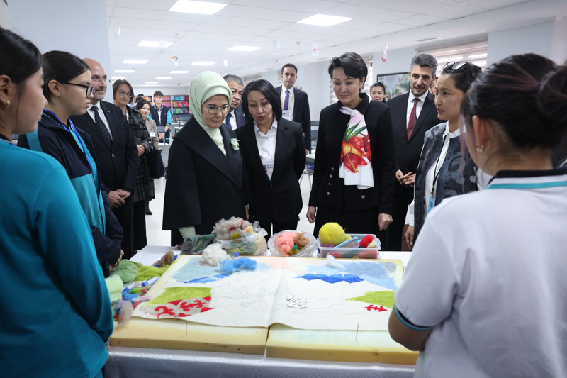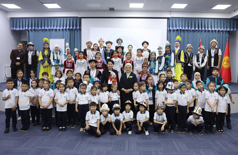 Emine Erdoğan ve Aygül Caparova, daha sonra Bişkek'te faaliyet gösteren TMV Eğitim Kompleksi'ne ziyarette bulundu.