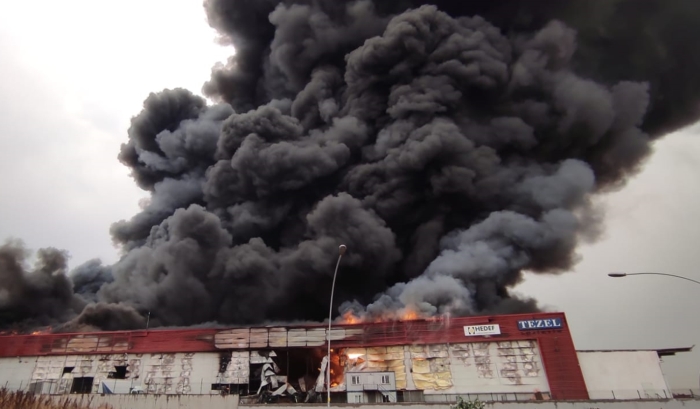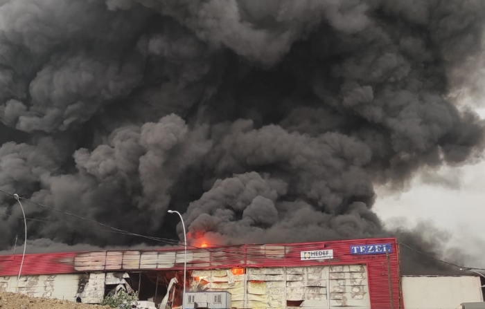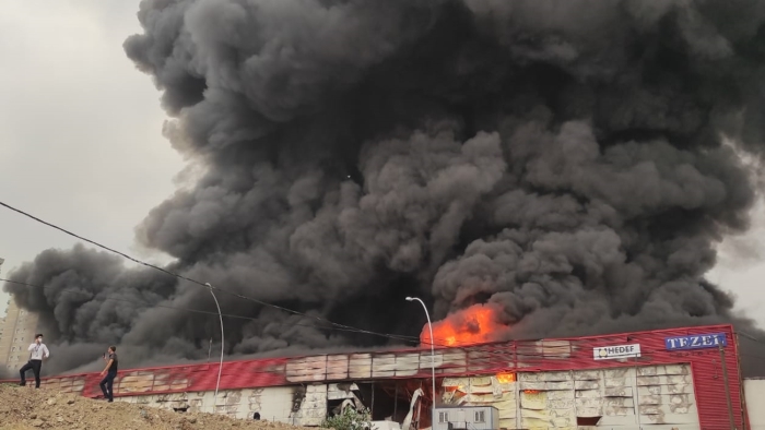 Yangın binayı tamamen sararken, depodan yer yer patlama sesleri de geliyor.