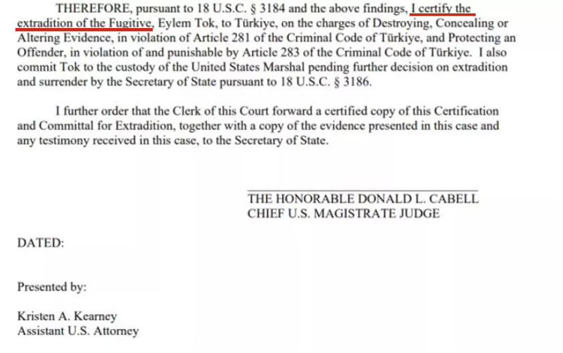 Savcının sunduğu metinde, '"Kaçak olan Eylem Tok'un Türk Ceza Kanunu'nun 281'inci maddesine aykırı olarak delilleri yok etmek, saklamak ve değiştirmek; ayrıca Türk Ceza Kanunu'nun 283. maddesine aykırı olarak suçluyu korumaktan Türkiye'ye iadesini onaylıyorum." ifadeleri kullanıldı.