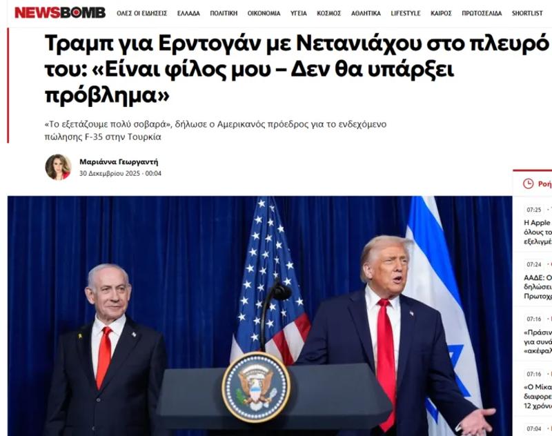 Yunanistan merkezli Newsbomb, Trump'ın Erdoğan'a yönelik olumlu ifadelerinin, Türkiye-İsrail geriliminin gündemde olduğu bir dönemde siyasi ağırlık taşıdığına dikkat çekti. Haberde, F-35 satışına ilişkin açıklamanın "sansasyon oluşturduğu" ifade edildi.