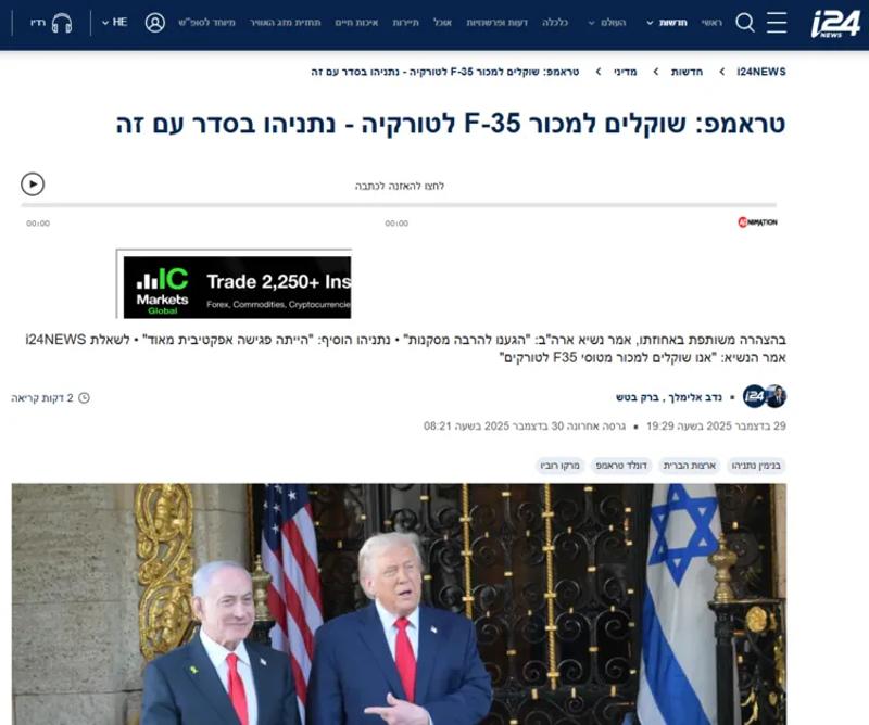 İsrail merkezli i24News, Trump'ın Türkiye'ye F-35 satışını açıkça gündeme getirdiğini vurgularken, İsrailli gazetecilerin soruları üzerine Trump'ın Erdoğan'ı övdüğünün altını çizdi.