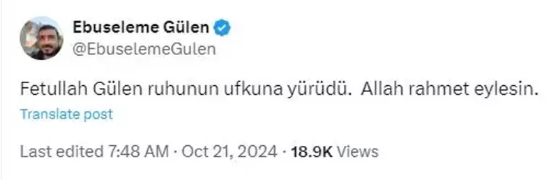 Ebuseleme Gülen sosyal medya platformu X üzerinden yaptığı açıklamada, 'Fetullah Gülen ruhunun ufkuna yürüdü. " ifadelerini kullandı.