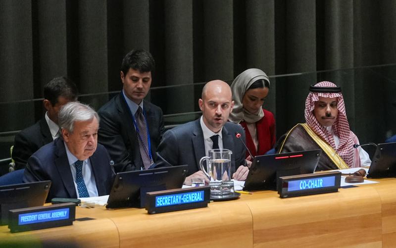 Fransız Bakan Barrot, Suudi mevkidaşı Faysal bin Ferhan ile Birleşmiş Milletler'de (BM) Filistin meselesine barışçıl bir çözüm bulunması ve iki devletli çözümün hayata geçirilmesi konulu Yüksek Düzeyli Uluslararası Konferans marjında yaptıkları ortak basın toplantısında konuştu.