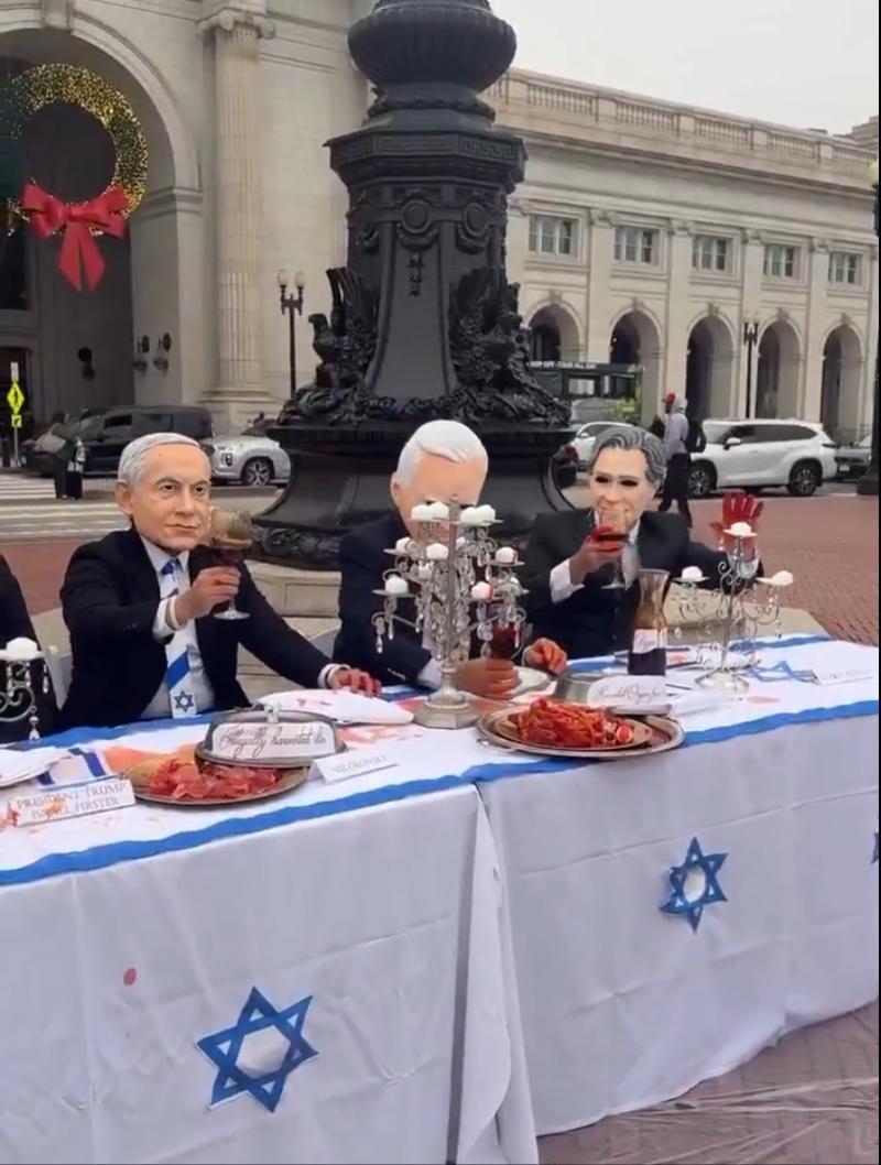 Yapılan eylemde soykırımcı Netanyahu ve destekçilerinin aynı sofrada kanlı bir yemek yediği sahne canlandırıldı.