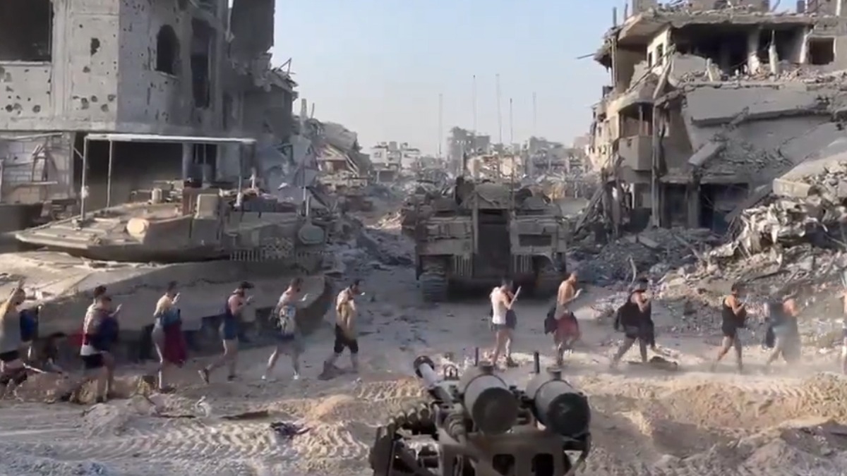 İsrail askerlerinin elbiselerini çıkarttığı bir grup Filistinli erkeğin iç çamaşırlarıyla tank ve zırhlıların önünden elleri havada geçtiği kameraya yansıyor.