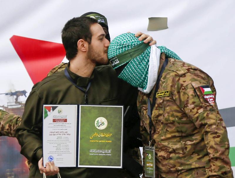 İsrailli esirlerden Omer Shem-Tov'un, serbest bırakılmadan önce platformda Kassam Tugayları savaşçılarının başını öpmesi dikkati çekti.