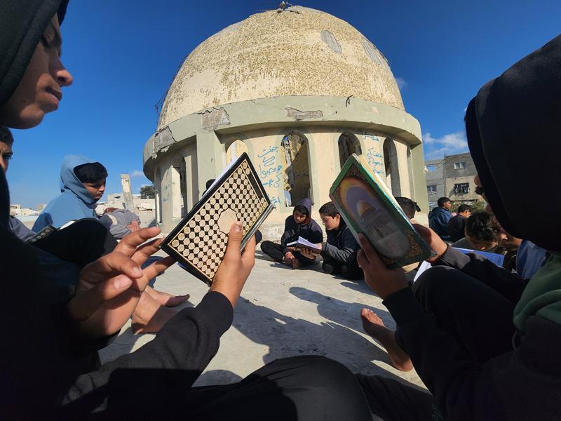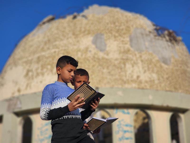 Gazze Şeridi'nin Han Yunus kentinde yaşayan Filistinli çocuklar, ramazan ayında iftar saatini beklerken günlerini, İsrail saldırısında ağır yıkıma uğrayan El Habib Muhammed Camisi enkazında Kuran-ı Kerim okuyarak geçiriyor.