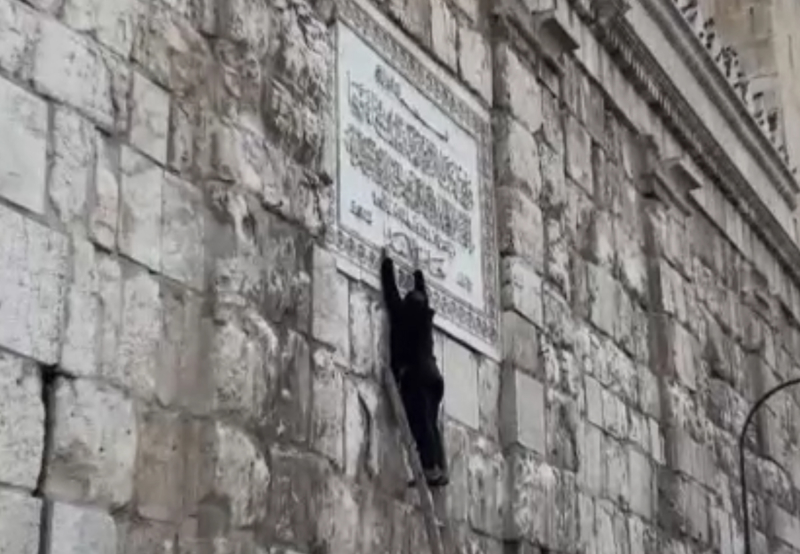 Levhadaki Nur suresinin 36 ve 37. ayetlerinin bitiminde, "Bu cami mümin başkan Hafız Esed döneminde yenilendi ve restore edildi." yazısı yer alıyordu.