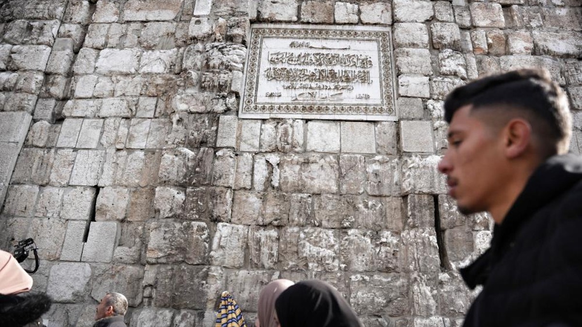 Vatandaşlar, namaz öncesi, caminin dış duvarındaki mermer levhada yer alan Hafız Esed'in ismini çekiçle kazıdı.