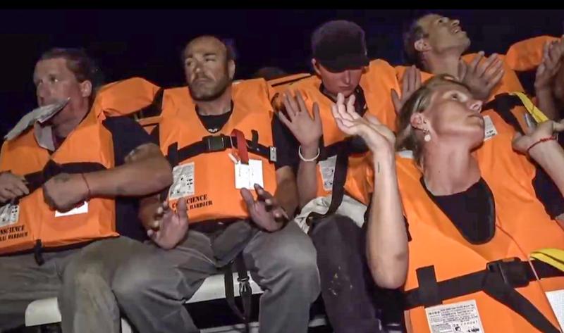 Yayında, anonslar sonrası gemilerdeki katılımcıların önceden belirlenen acil durum protokollerine göre can yeleklerini giyerek oturmuş halde beklediği görüldü.
