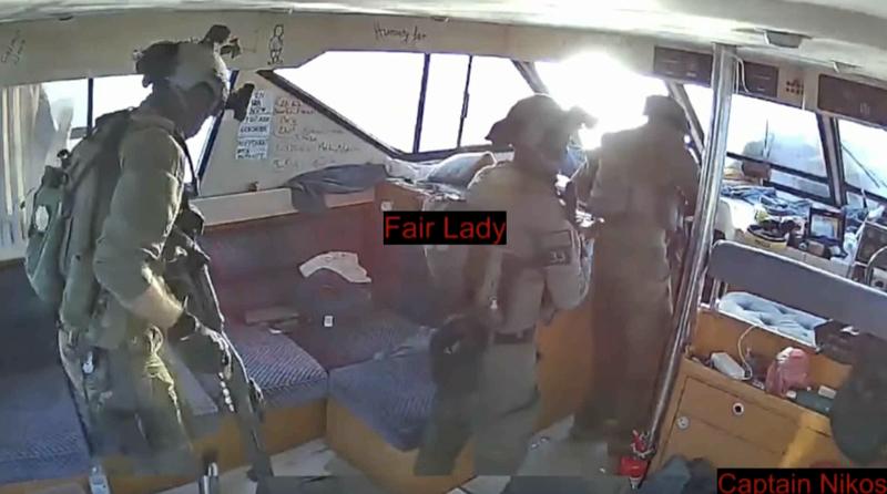 Filo'nun internet sitesinden aktarılan canlı yayında, Captain Nikos gemisindeki aktivistlerin alıkonulmasının ardından silahlı İsrail askerlerinin gemiye girdiği anlar paylaşıldı.