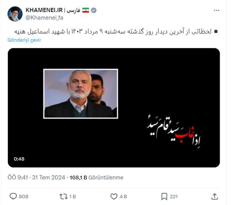 İran Dini Lideri Ayetullah Ali Hamaney, X hesabından yaptığı açıklamada, "Bir seyyid gider, bir seyyid gelir" mesajını paylaştığı bir video yayınladı. Hamaney, dün İran'da Haniye ile görüşmüştü.