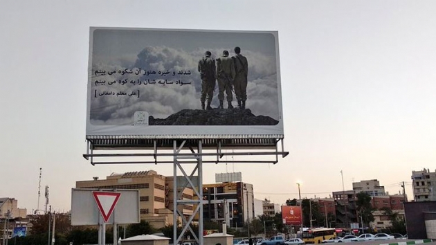 Şiraz Belediyesi tarafından 1980-88 yılları arasındaki İran-Irak savaşının yıl dönümü dolayısıyla hazırlanıp kentteki bir meydana asılan afişte kayalık bir tepe üzerinde duran üç erkek askerin arkadan çekilmiş fotoğrafını kullandı.
