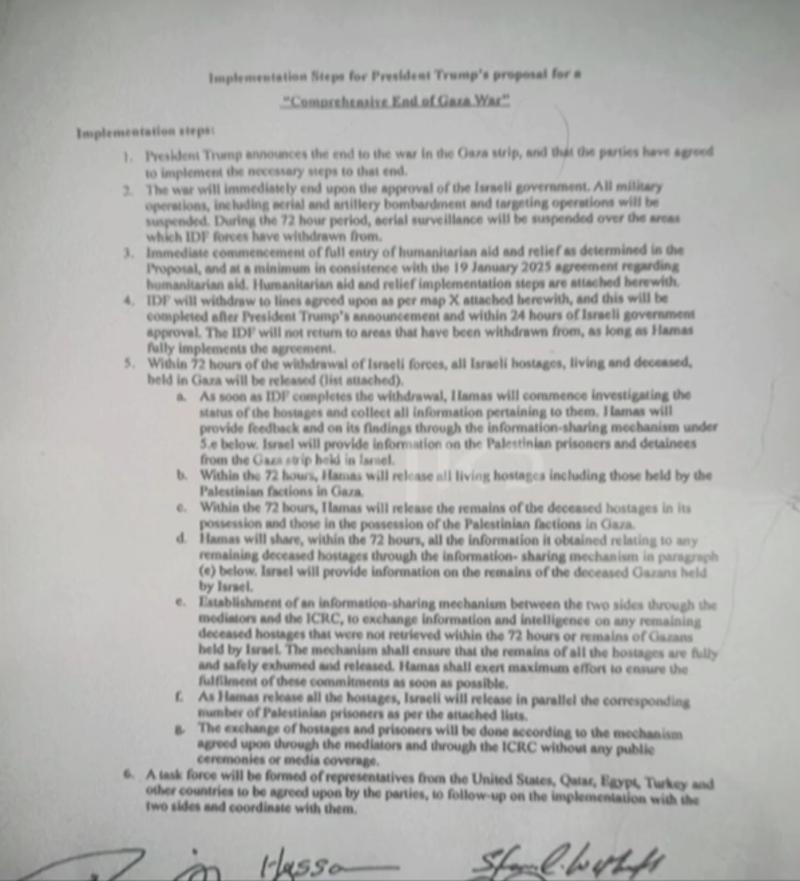 Onaylanan anlaşmaya göre; Askeri operasyonlar tamamen durdurulacak, İsrail güçleri kademeli olarak Gazze'den çekilecek, rehineler serbest bırakılacak, Filistinli tutuklularla takas yapılacak, Gazze'ye insani yardım geçişi kesintisiz sağlanacak.İlk maddeye göre, Başkan Trump'ın duyurusunun ardından Gazze Şeridi'ndeki savaş resmen sona ermiş sayılacak. Taraflar, bu hedef doğrultusunda gerekli adımların atılması konusunda uzlaştı. İsrail hükümetinin onayının hemen ardından tüm askerİ operasyonlar, hava saldırıları, topçu atışları ve hedef alma operasyonları dahil, 72 saat boyunca tamamen durdurulacak.