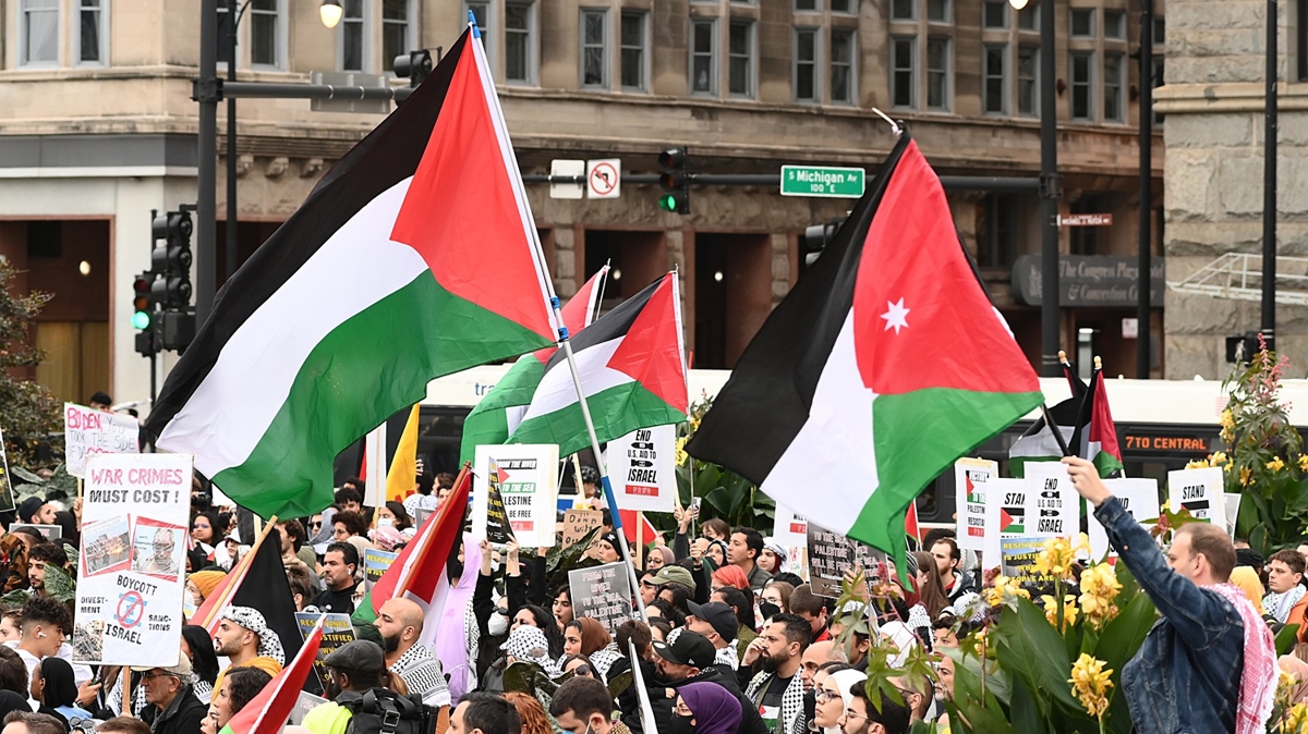 Görüntülere yoğun biber gazına maruz kalan, elleri ve omuzlarında Filistin bayrakları taşıyan göstericilerin koşması yansıdı.