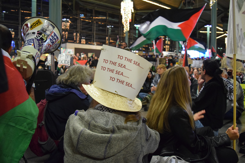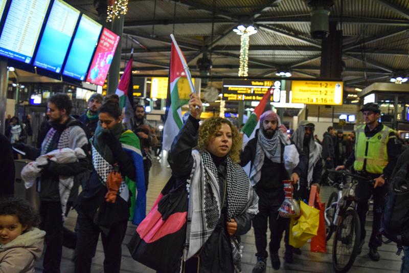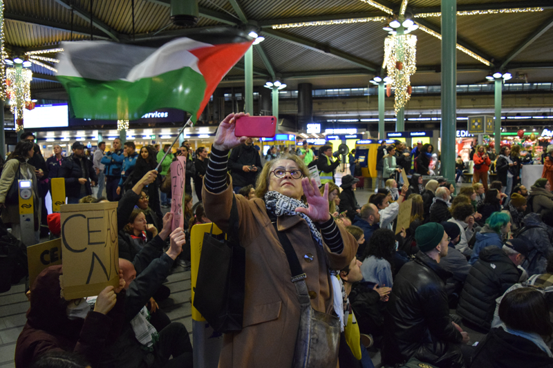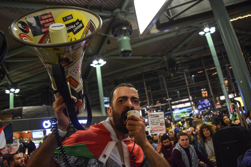 Havalimanının içinde başlayan ve sonrasında olumsuz hava koşullarına rağmen havalimanının önünde devam eden gösteriye katılan yüzlerce kişi, Filistin halkıyla dayanışma içinde olduklarını dile getirdi, başta Hollandalı siyasetçiler olmak üzere Avrupa Birliği (AB) ve ABD'nin İsrail'i desteklemesini eleştirdi.