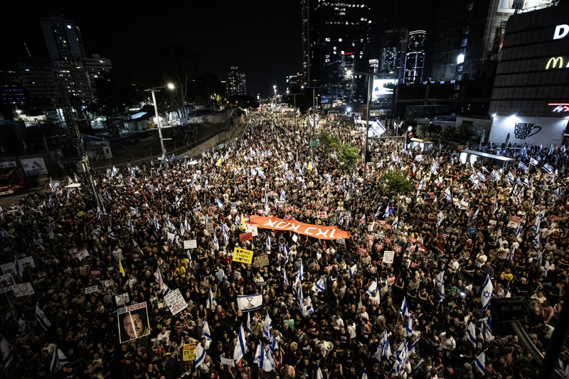 Hükümet karşıtı gruplara katılan on binlerce kişi, Gazze'ye saldırıların sonlandırılmaması ve esirlerin geri getirilmesi konusunda siyasi iradenin kayıtsızlığını eleştirerek, ülke tarihinin "en sağcı hükümetinin" istifasını ve erken seçim talep ettikleri protestolarını yineledi.