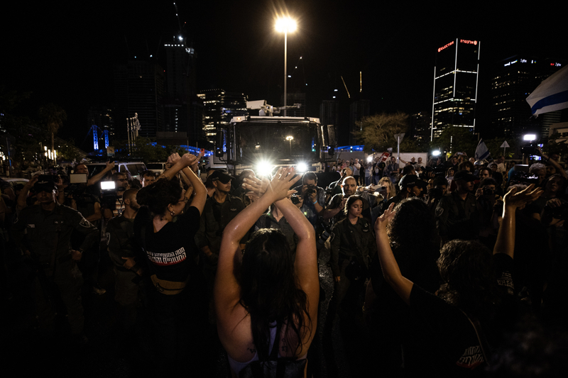Kaplan Caddesi'nden yürüyerek bakanlık binasının önündeki Menachem Begin Caddesi'ne gelen hükümet karşıtı protestocular, esir takası talep eden göstericilerle eylemlerini sürdürdü.