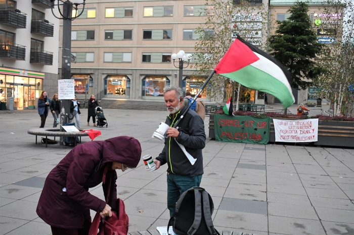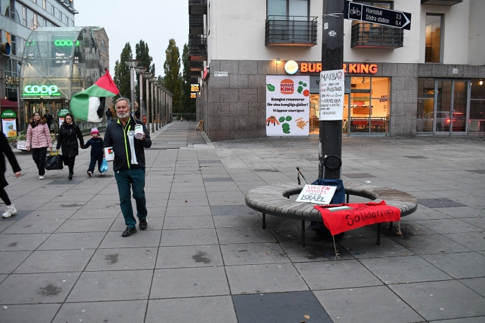 Aktivist ve akademisyenlerin kurduğu İsveç Filistinliler Derneğince Medborgare Meydanı'da yapılan eylemde, İsrail mallarının alınmaması ve İsrail'e tatile gidilmemesi çağrısı yapan broşürler dağıtıldı.