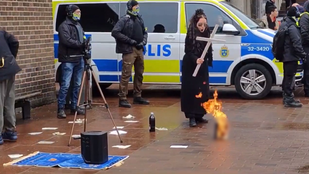 İsveç'in başkenti Stockholm'de Jade Sandberg isimli bir kadın, elinde haç ile polis korumasında Kur'an-ı Kerim mushafını yaktı.