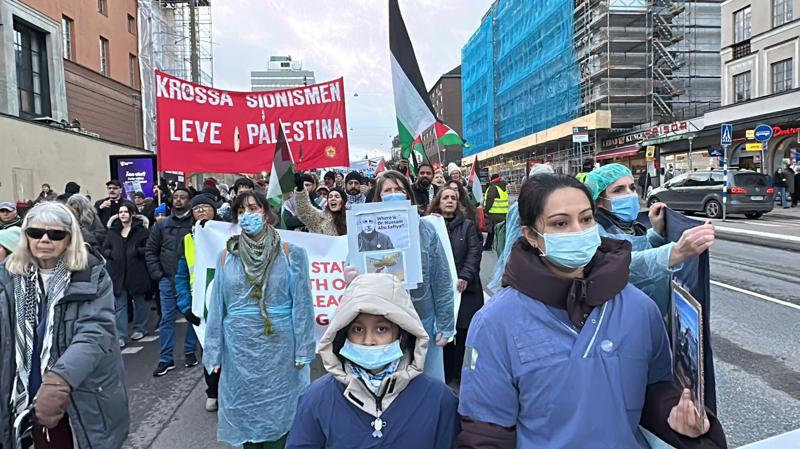Çok sayıda sivil toplum kuruluşunun çağrısıyla Odenplan Meydanı'nda bir araya gelen kalabalık, "İsrail ateşkese uymuyor", "Soykırımı durdurun" ve "Sonsuza kadar Filistin" yazılı pankartlarla İsveç Parlamentosu'na yürüdü.
