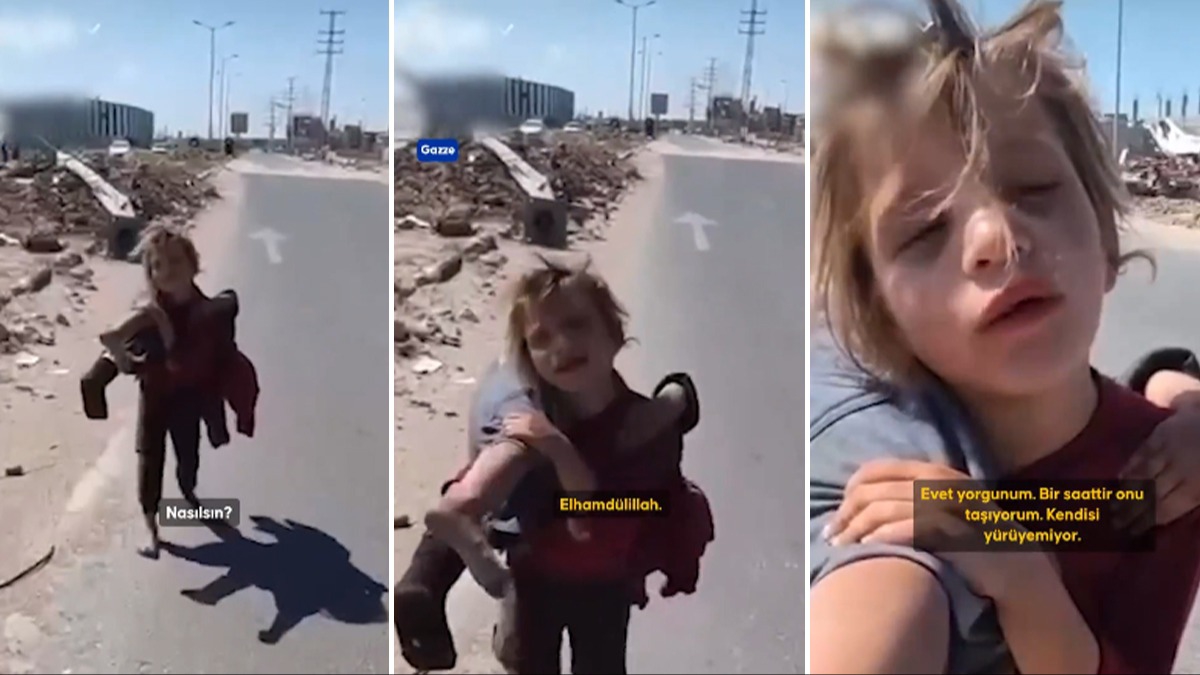 "ONU TEDAVİ İÇİN GÜVENLİ BİR YERE GÖTÜRÜYORUM"Kardeşini uzun süredir sırtında taşıdığını söyleyen küçük kız çocuğu, "Elhamdülillah... Kardeşime araç çarptı ve ayağından yaralandı. Onu tedavi için güvenli bir yere götürüyorum." diye karşılık veriyor.
