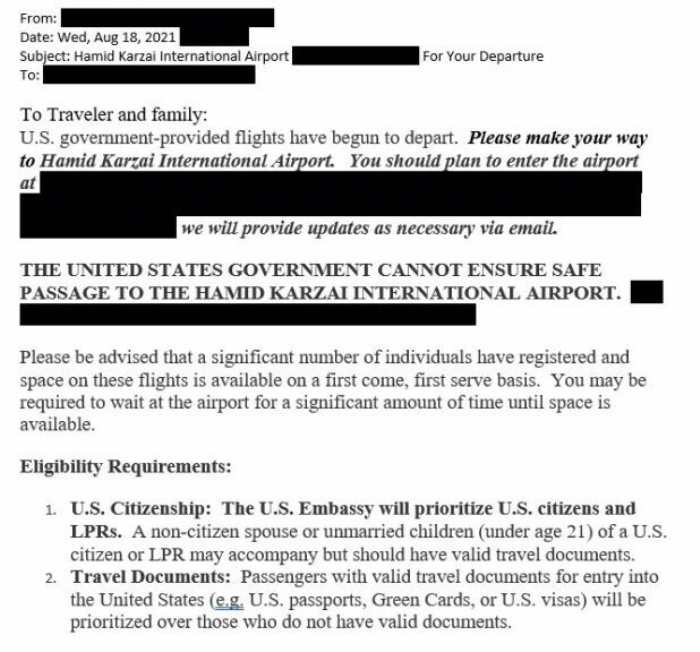 Maillerde ayrıca ABD'nin havalimanına gelişlerde güvenlik garantisi vermediği ifade edildi. Bu mailleri alanlar Afganlar, tahliye edilecekleri tarih gelmeden havalimanına akın etti. ABD askerleri, belgeleri ve ellerindeki listeleri tek tek kontrol ederek Afganları alana aldı. Ancak bu listenin varlığının ortaya çıkması da kaosa neden oldu. ABD'ye çalıştığı halde kendisine mail gelmeyen Afganlar da havalimanına akın ederek, kendilerinin de götürüleceği umudu ile bekleyişe geçti. ABD askerleri ve Taliban unsurlarının zaman zaman bekleyişte olan halka karşı silah kullandığı belirtiliyor. Resmi olmayan rakamlara göre havalimanında çıkan olaylarda 40'a yakın insanının ölü/yaralı olduğu ifade ediliyor.