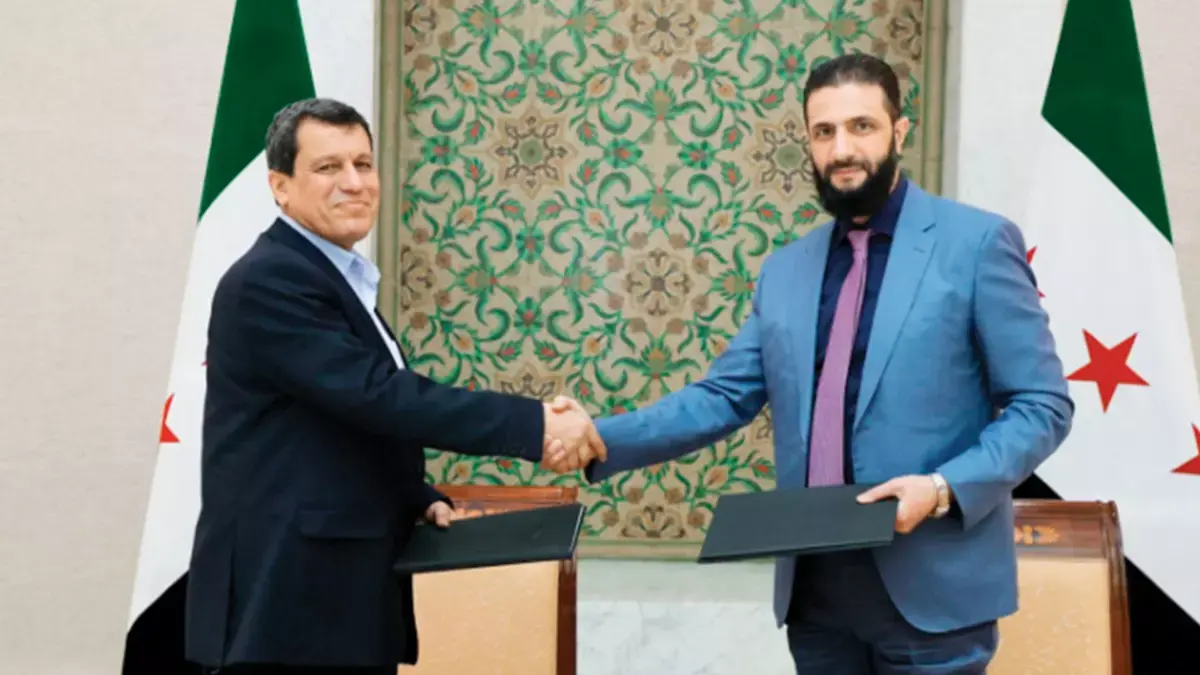 Suriye Cumhurbaşkanı Ahmed Şara (sağda) ile SDG elebaşlarından Mazlum Abdi, 8 maddelik anlaşmayı 10 Mart'ta imzalamıştı.