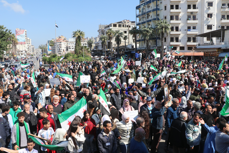 Lazkiye kent merkezinde Şeyhdahır meydanında toplanan yüzlerce sivil, "Devrik rejim güçleri altyapıyı yok etti", "Şara hükümeti beni temsil ediyor" ve "Hepimiz güvenlik güçleri ile beraberiz" Arapça yazılı pankartlar açtı.
