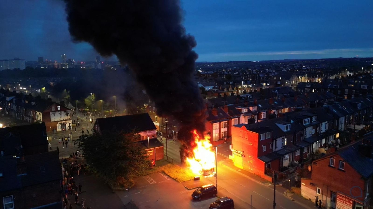 Sosyal medyada paylaşılan görüntülerde kalabalığın bir polis aracının camlarını çocuk arabası, taş ve bisikletlerle kırdıktan sonra aracı devirdiği görüldü. Ayrıca, görüntülerde göstericilerin çift katlı bir toplu taşıma aracını ateşe verdiği kaydedildi.