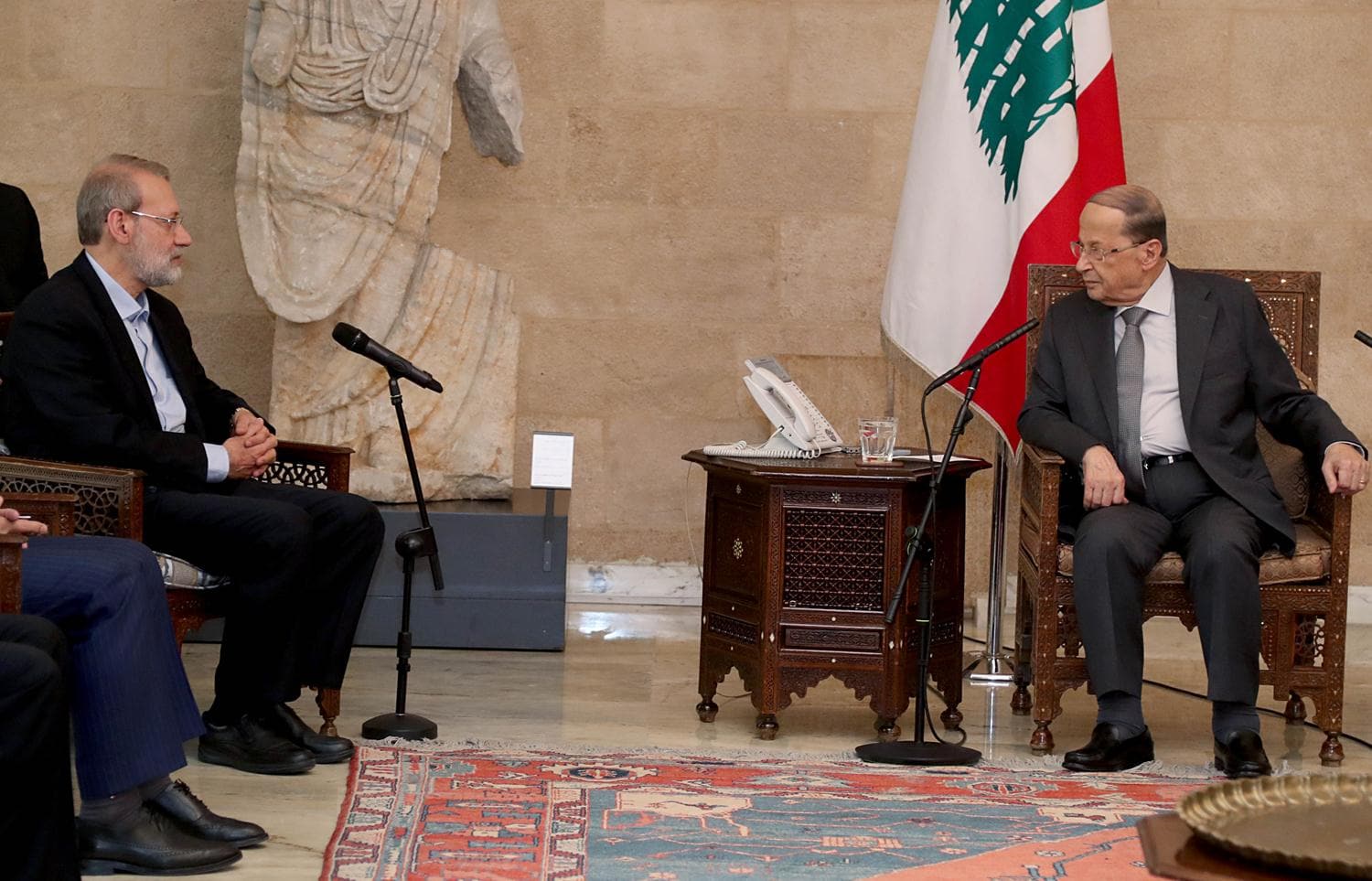 Lübnan Cumhurbaşkanlığından yapılan yazılı açıklamaya göre, Avn, Laricani ve beraberindeki heyeti başkenti Beyrut'taki Baabda Cumhurbaşkanlığı Sarayı'nda kabul etti.