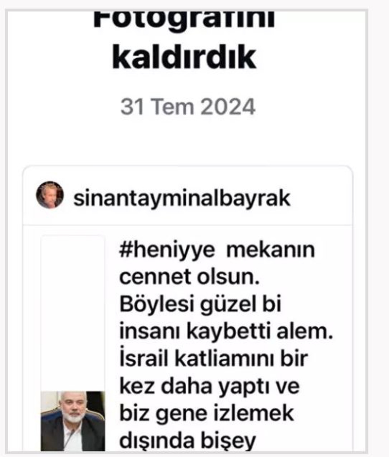Paylaşım, herhangi bir gerekçe gösterilmeden 'fotoğrafını kaldırdık' ifadeleriyle oyuncunun hesabından kaldırıldı.