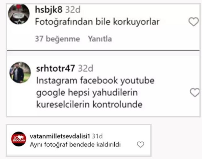 Sinan Albayrak'ın takipçileri yaşanan olaya, 'Fotoğrafından bile korkuyorlar. Instagram, Facebook, Youtube, Google, hepsi Yahudilerin ve küreselcilerin kontrolünde' diyerek tepki gösterdi.