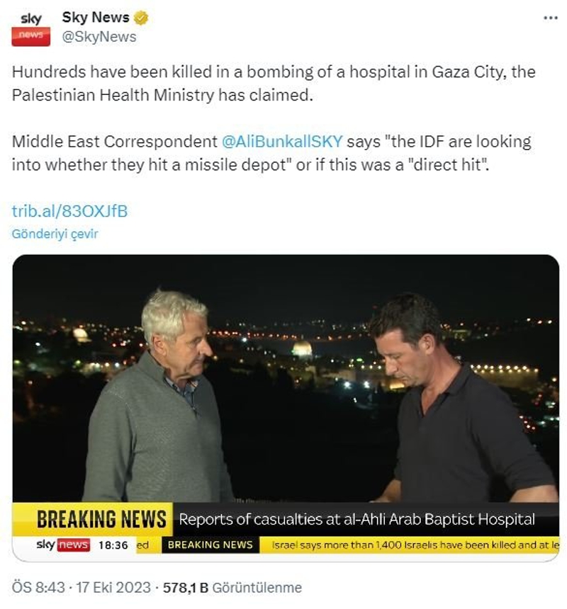 Yayında konuşan Sky News Orta Doğu muhabiri Alistair Bunkall, "İsrail ordusu, füze deposunu mu vurdu yoksa doğrudan ya da yanlışlıkla hastaneyi mi vurdu, araştırıyor" ifadesini kullandı.